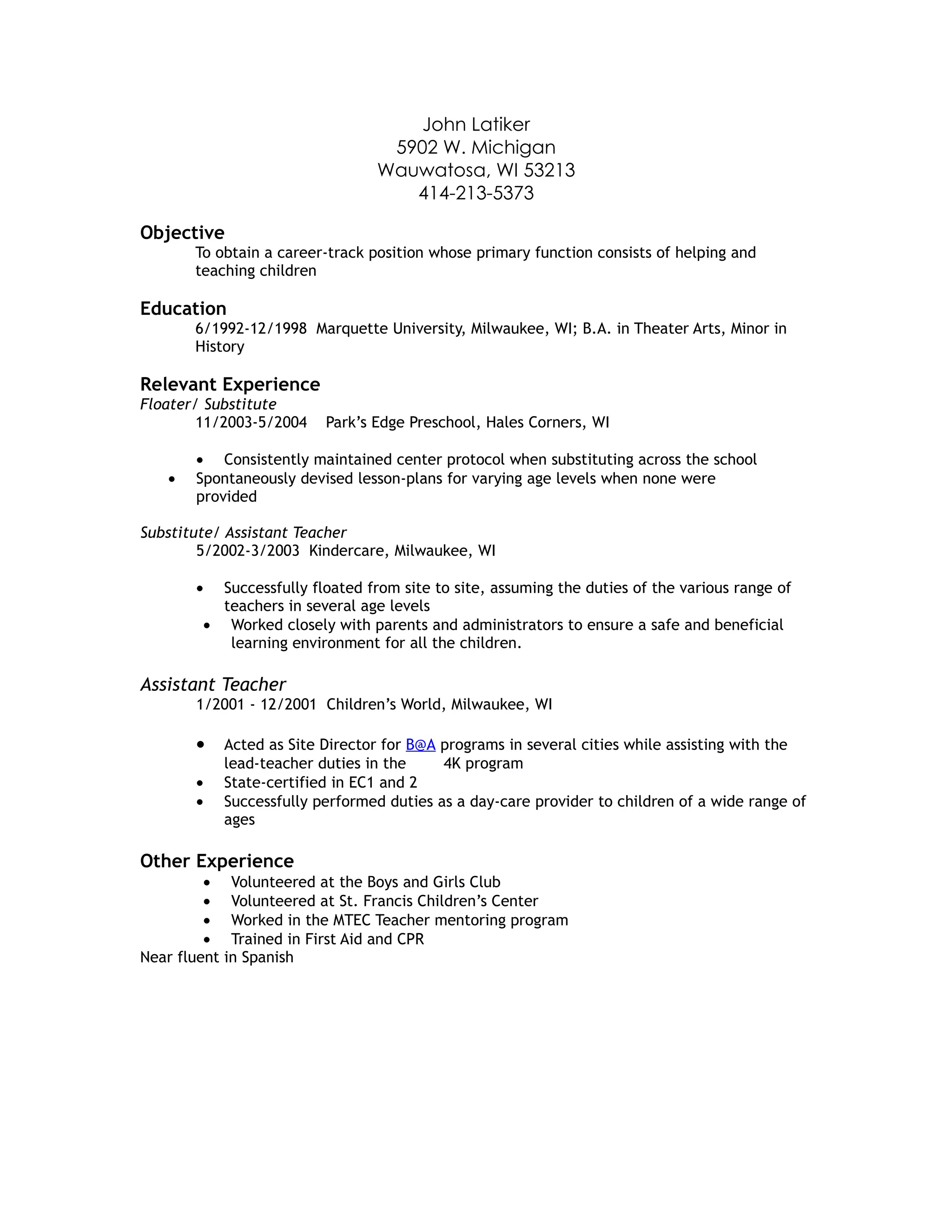John Latiker is seeking a career-track position helping and teaching children. He has a B.A. in Theater Arts and a minor in History from Marquette University. His relevant experience includes substituting at preschools and daycares, where he devised lesson plans and maintained safety and protocols. He has also worked as an assistant teacher and site director at various childcare centers, and has state certifications in early childhood education. Latiker has additional experience volunteering with children and is fluent in Spanish.