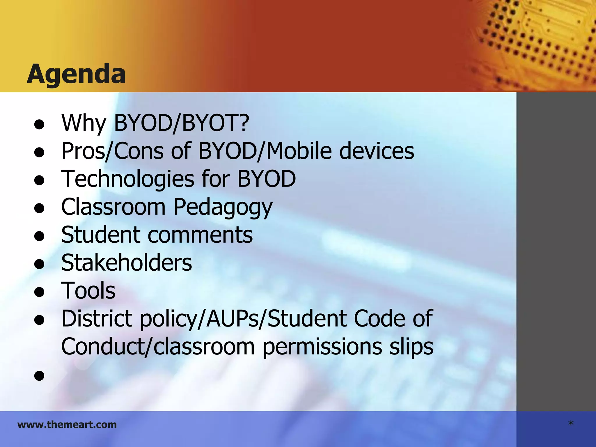 This document summarizes a presentation on implementing Bring Your Own Device (BYOD) programs in classrooms. It discusses the benefits of BYOD like extending technology resources and connecting to students' personal devices, as well as challenges around equity, WiFi access, and teacher professional development. The presentation reviews different mobile devices students may bring, how BYOD impacts classroom pedagogy and management, and considerations for administrators, students, and parents. Examples of responsible BYOD agreements from various school districts are also provided. The presenter's contact information is included at the end.