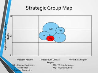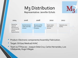 M3 Distribution is an electronic components distributor targeting the oil, gas, medical, and HVAC industries. It was established in 2004 and has since expanded its product offerings and facilities. The company aims to provide high customer service and quality. It faces moderate competitive pressures in its industry and sees opportunities in regional expansion and leveraging its certifications and connections to employers. Its strategy focuses on low costs, differentiation through goodwill and communication, and related diversification through maximizing synergies across capital resources. Both short-term and long-term strategic issues center around gaining customers, retaining suppliers, and improving competitive advantages.
