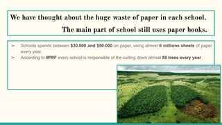 1) The document proposes a solution to reduce paper usage in schools by creating a shared digital network where textbooks and other materials can be accessed, reducing costs.