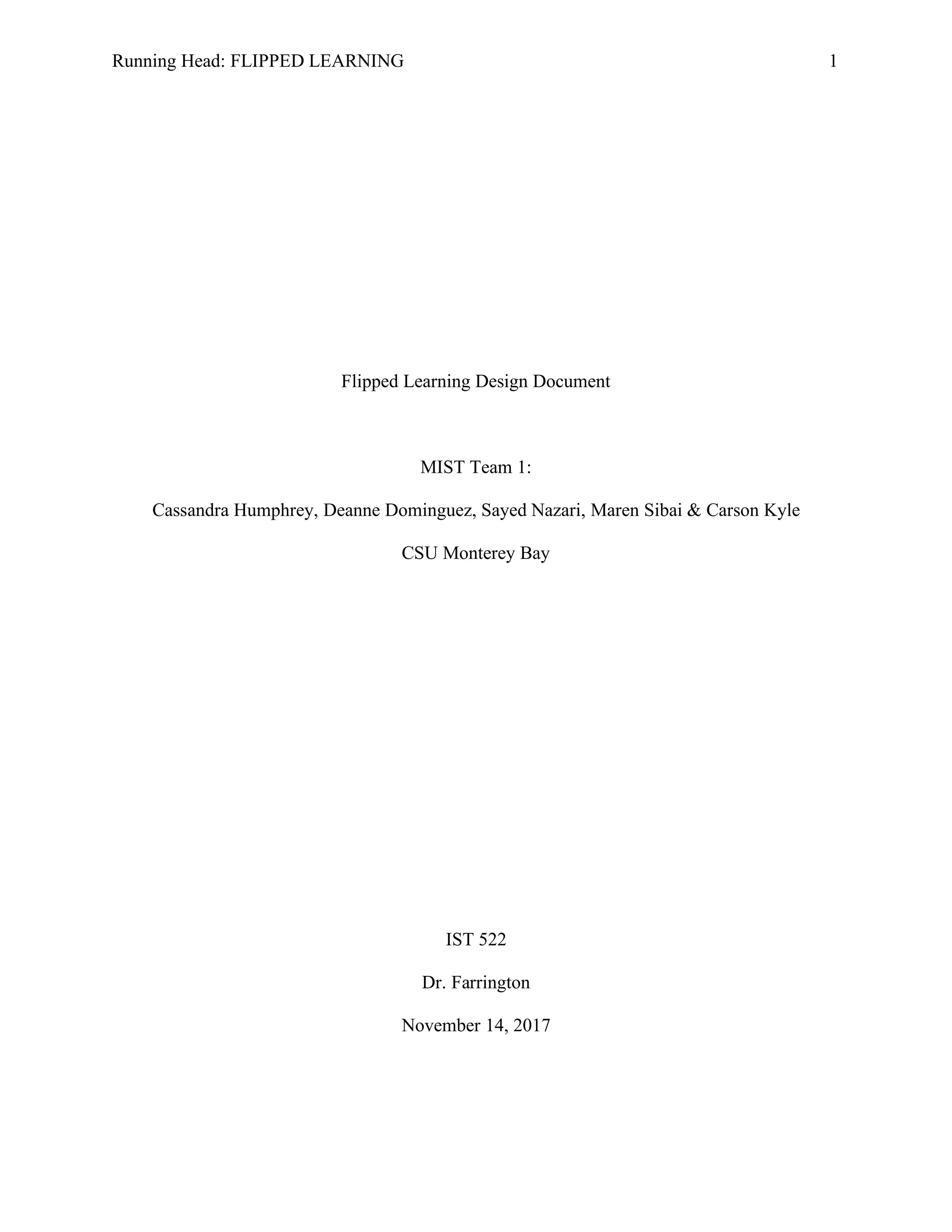 The document provides an overview of flipped learning design for an instructional technology course. It defines flipped learning as moving direct instruction from group to individual learning space, transforming the group space into an interactive environment guided by the educator. A needs assessment found students had varying backgrounds but most were familiar with flipped learning. The content section describes flipped learning's focus on a learner-centered approach through interactive lessons and flexible instruction meeting learners' needs. Key aspects include video lessons, interactive activities, and using technology to promote independent and collaborative learning.