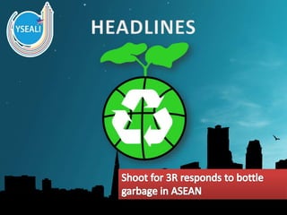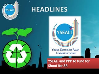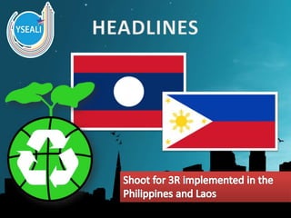 This document outlines a recycling program in Laos that collects plastic water bottles used by participants in a youth leadership program. The program collects 1,440 bottles per week which are then sorted - 50% are sold for income to support an environmental hub, while the other 50% are made into handicrafts to be sold with profits going to students, schools, and environmental hubs. The program schedule and funding needs are also summarized.
