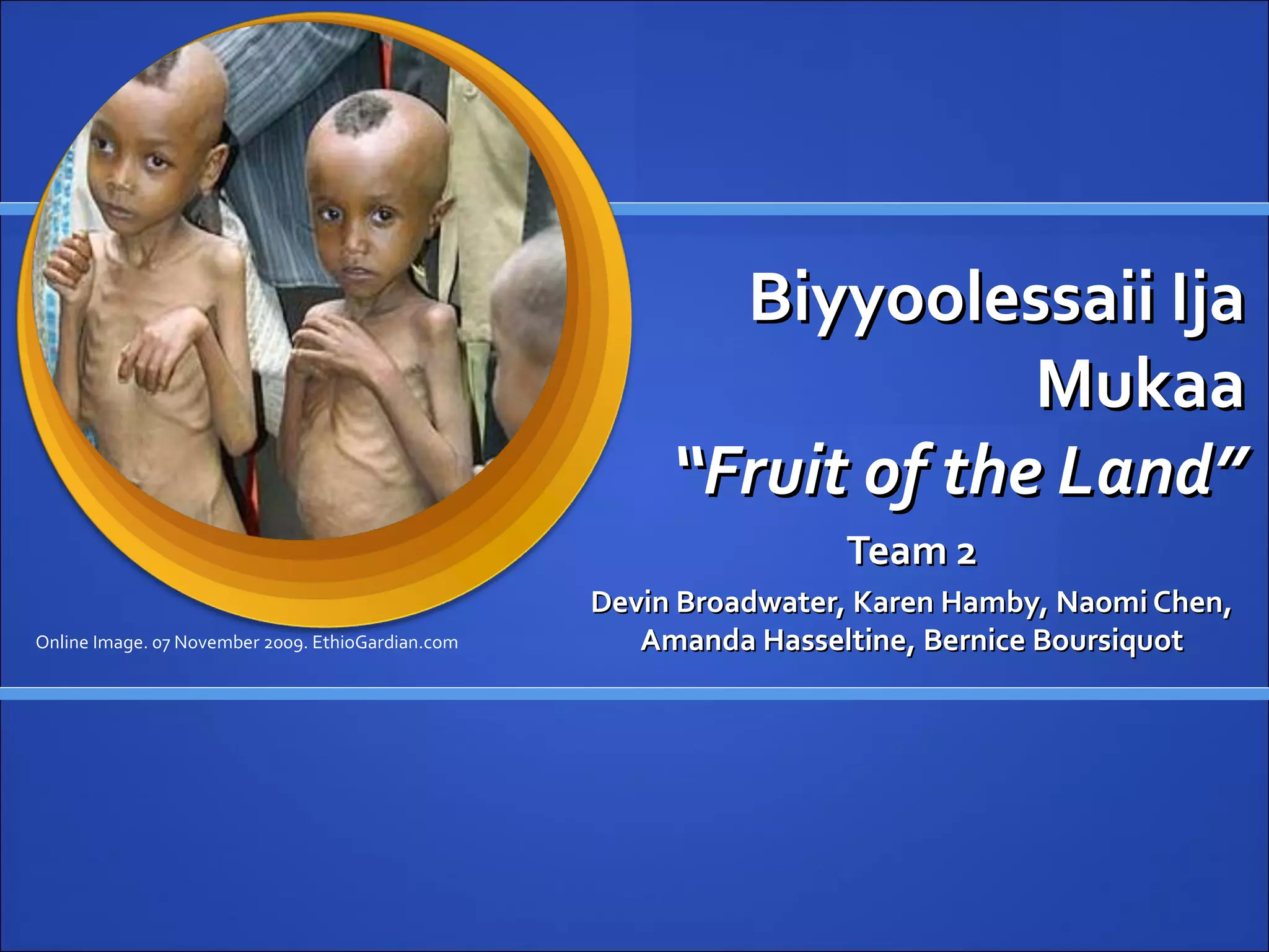 This document outlines a presentation on combating child malnutrition in the Oromiya region of Ethiopia. It provides background demographics on the region, introduces an average Oromo family, and discusses the current health crisis of child malnutrition. A two-pronged strategy is proposed that includes short-term emergency food aid alongside a longer-term comprehensive approach. The comprehensive approach would develop local ready-to-use therapeutic foods, train community health advisors, and use radio soap operas for mass communication. Funds of $1 million USD would be allocated with 15% for short-term needs and 85% for long-term strategies.