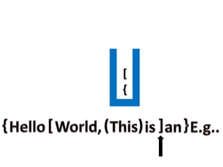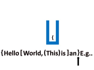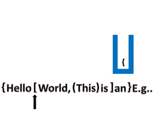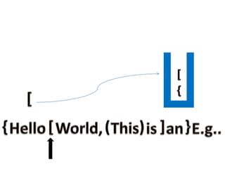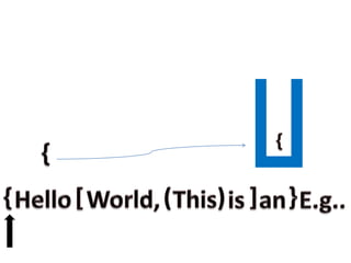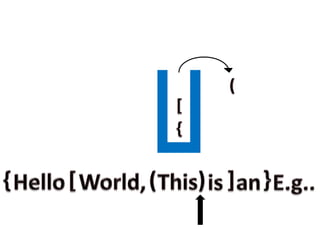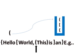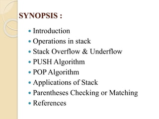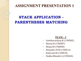 The document discusses a team presentation on using a stack data structure to check for matching parentheses in an expression. It defines what a stack is, the push and pop operations, and provides pseudocode for algorithms to add and remove elements from a stack. It then explains how to use a stack to check an expression by pushing opening parentheses and popping closing ones, identifying whether the stack is empty after as a way to check matching. Examples of expressions are provided to demonstrate the algorithm.