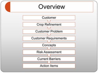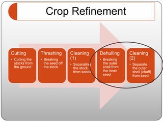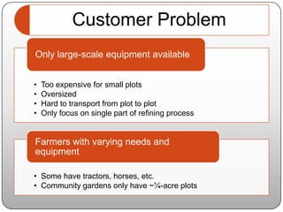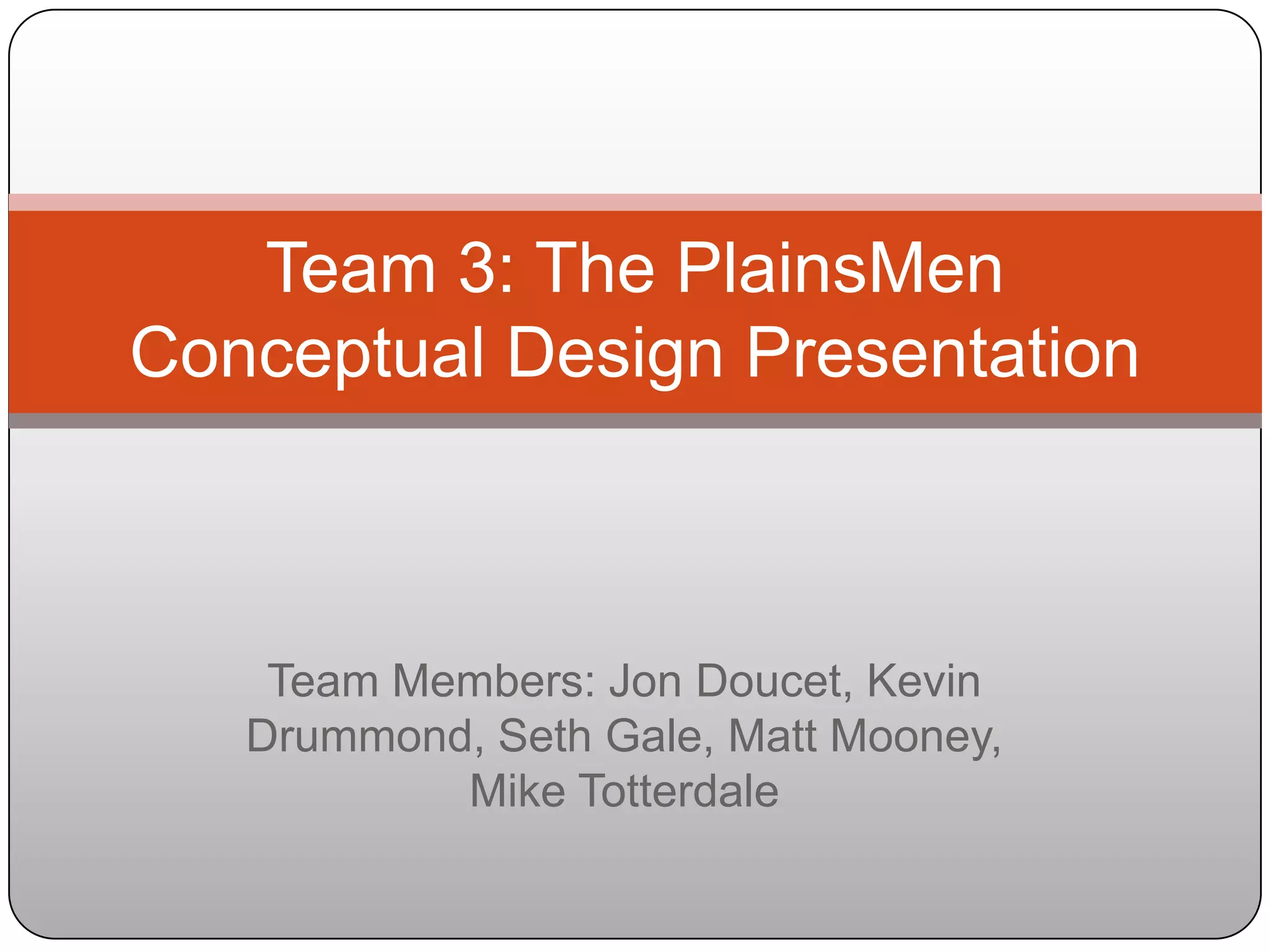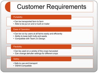 This document outlines a conceptual design presentation by Team 3 called "The PlainsMen" for a seed input system. It lists the team members and includes a diagram showing how the design uses concave walls and air forced upwards to blow away light chaff while allowing heavier seeds to continue through for collection.