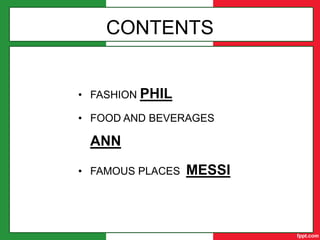 The document discusses Italy's fashion industry and culture. It outlines three key features of Italy's fashion - craftsmanship, family businesses, and networking. Specific cities like Florence and Milan are mentioned as being centers of fashion. The document also briefly mentions popular Italian foods like lasagna, pizza, risotto and tiramisu. Famous landmarks in Italy including the Tower of Pisa, Colosseum, Trevi Fountain and Vatican City are listed.