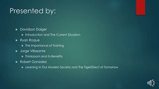 TigerDirect is proposing adopting the online training platform Thinkzoom to address issues with their lack of employee training. Thinkzoom offers a wide range of training videos on various topics that can be customized for TigerDirect's needs. It will allow employees to train at their own pace and provide tools to track progress. TigerDirect believes Thinkzoom can help improve customer service, sales performance, and overall employee knowledge. This will help TigerDirect gain an advantage over competitors by having staff that performs professionally.