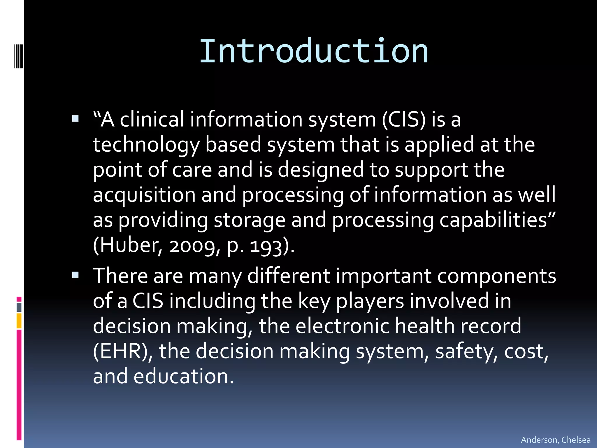 A clinical information system (CIS) integrates various technologies to provide a centralized repository of patient information to help clinicians make decisions. Key players in choosing, implementing, and revising a CIS include nurses, physicians, pharmacists, hospital administration, support staff, IT personnel, patients/families, and other health professionals. An effective CIS contains components like the electronic health record, order entry, decision support, and communication tools to safely and efficiently deliver patient care.