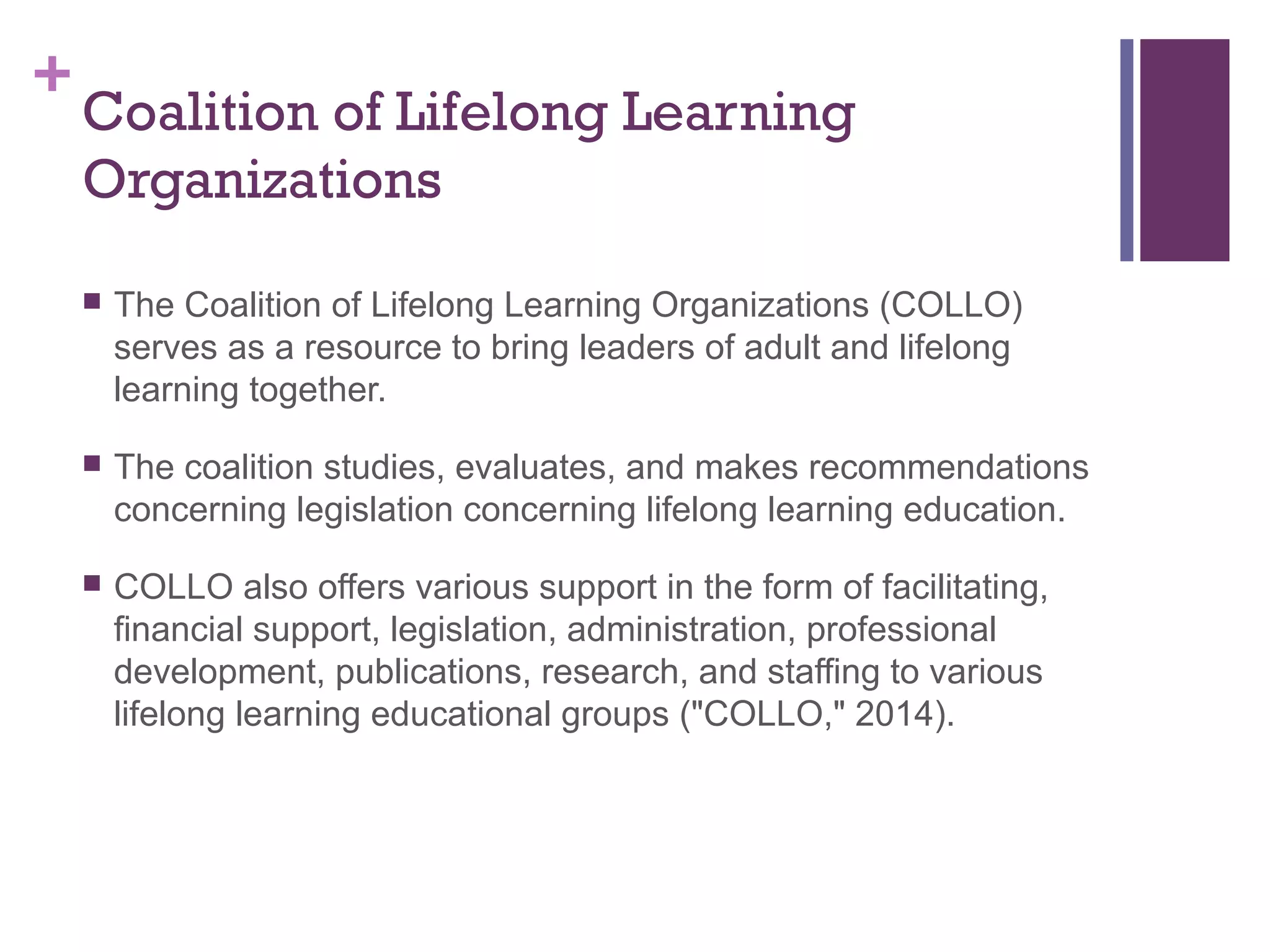The document discusses several organizations that support lifelong learning. The Coalition of Lifelong Learning Organizations (COLLO) brings together leaders of adult education to exchange information and collaborate. Other groups discussed include the American Association for Adult and Continuing Education, National Institute of Adult Continuing Education, UNESCO Institute for Lifelong Learning, and Council for Adult and Experiential Learning. Each organization works to promote opportunities for lifelong learning and its benefits.