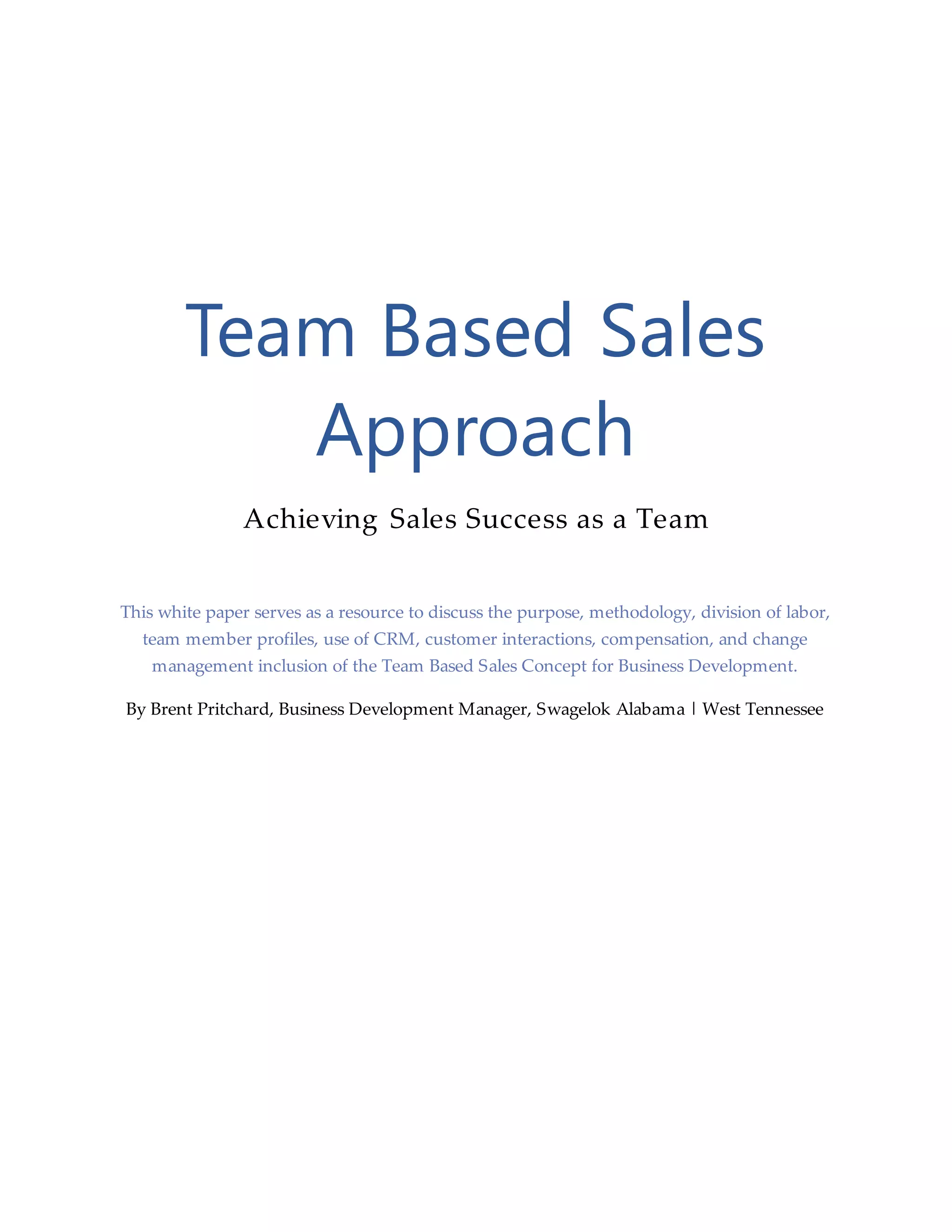 The document discusses implementing a team-based sales approach to achieve sales success. It involves dividing labor among internal and external sales associates, with internal associates generating and qualifying leads that are passed to external associates for closing deals. The methodology also relies on using a CRM system to track opportunities and ensure seamless customer interactions. Implementing this approach requires defining roles and compensation models to motivate the team and drive the desired behaviors to transform the sales process from reactive to proactive. Change management is also needed to successfully adopt the new approach.