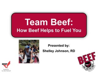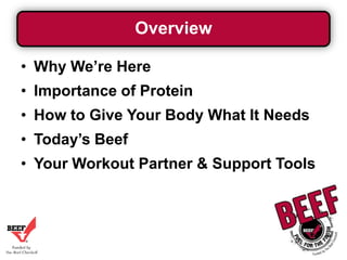 The document discusses how lean beef can help fuel physical activity. It provides an overview of a presentation about the importance of protein for weight management, boosting immunity, brain development and preventing disease. Lean beef is a natural source of protein and other essential nutrients that helps build muscle, increase calorie burning and fuel workouts. The presentation provides tips on including lean beef in meals throughout the day to meet protein needs and recipes for beef on-the-go. It directs attendees to online beef resources for more information.
