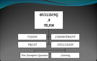 The document discusses the distinctions between teams and groups, emphasizing that team members collaborate towards mutual goals while group members often work independently with limited accountability. It illustrates lessons from the fable of the tortoise and hare, concluding that successful teamwork leverages individual strengths to achieve common objectives. The text also outlines Bruce Tuckman's stages of team development and highlights the benefits of teamwork in enhancing organizational effectiveness and individual satisfaction.