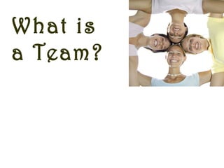 The document discusses how to build an effective team. It defines a team as a group mutually dependent on each other to achieve a common goal. It lists several objectives for an effective team, including setting clear goals, defining roles, communicating openly, making decisions, balancing participation, valuing diversity, managing conflict, creating a positive atmosphere, developing cooperative relationships, and utilizing participative leadership. It provides further details on steps to take for several of these objectives, such as setting clear goals, defining roles, communicating clearly, making decisions, balancing participation, valuing diversity, managing conflict, and creating a positive atmosphere.