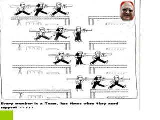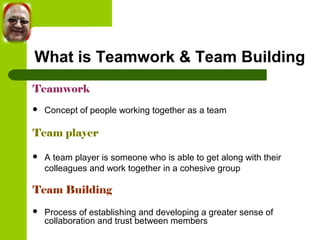 The document discusses team building and the stages of team development. It describes teamwork as people working together towards common goals, with defined roles and effective communication. The four stages of team development are: forming, storming, norming, and performing. In forming, a team establishes goals and roles. Storming occurs as challenges emerge and attitudes fluctuate. During norming, members accept their roles and each other. In performing, the team works cooperatively and is able to prevent and resolve conflicts to achieve goals. Key aspects of successful teams include commitment, clear roles and processes, and strong interpersonal relationships.