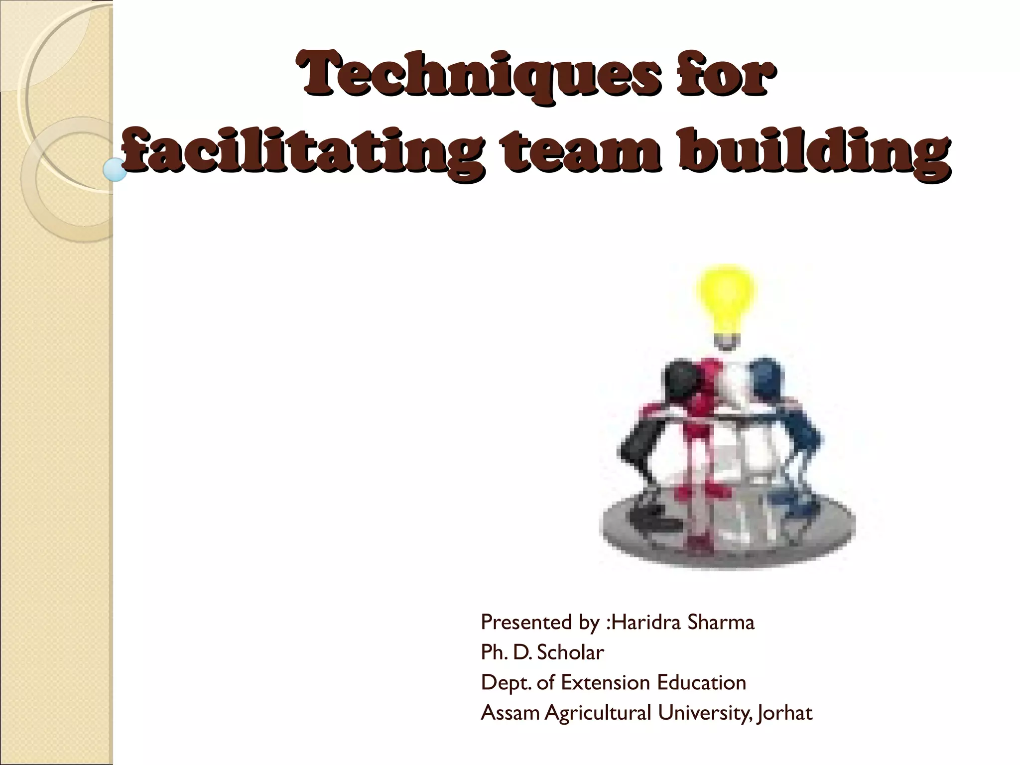 The document discusses techniques for facilitating team building. It defines the differences between a group and a team, and describes the stages of team building including forming, storming, norming, and performing. Several approaches and exercises for team building are presented, such as setting goals, problem solving exercises, and trust exercises. Examples of specific team building activities are provided, like the blind numerical order exercise, all tied up activity, and build a car exercise. The goals of team building are also summarized, such as improving communication, motivation, and productivity.