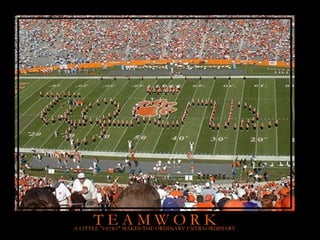 This document discusses successful team building and outlines benefits, roles, qualities of effective team builders, and ways teams can fail. It notes that building teams can help maximize output, eliminate self-interested attitudes, and determine true leaders. Effective team builders are selective in choosing members, provide support, are open and honest, encourage interaction, and provide proper training. Teams can fail due to poor planning, bad attitudes, lack of focus on goals, hidden agendas, or having the wrong team members.