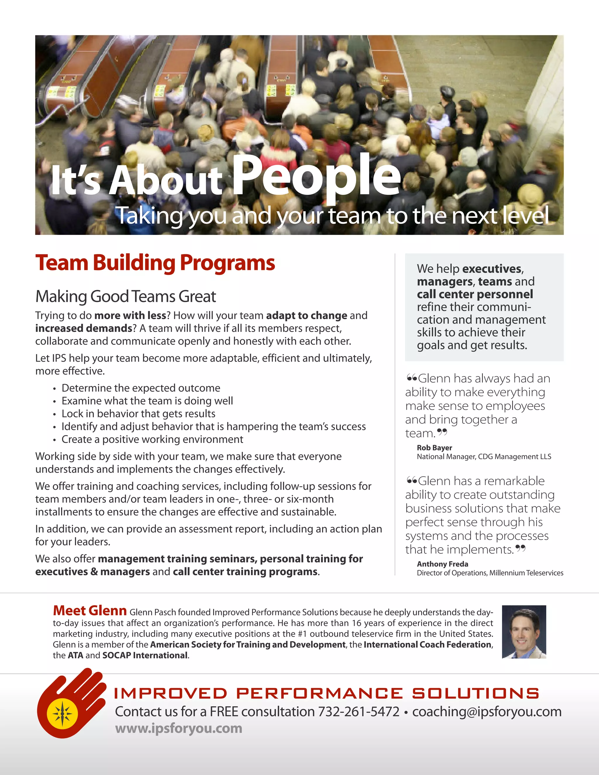 Improved Performance Solutions offers team building programs designed to enhance communication and collaboration among teams to improve efficiency and adaptability. Founded by Glenn Pasch, the company provides training, coaching, and assessments tailored to meet the needs of executives and managers in various sectors. Their services include follow-up sessions and action plans to ensure sustainable changes within organizations.