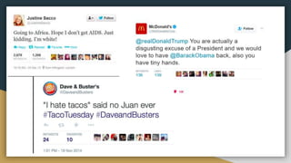 The document discusses how social media can be used for promotions, market research, and customer segmentation. It examines different types of consumer-generated content and integrated marketing communication strategies. Finally, it provides best practices for social media strategic planning, awareness and engagement, search engine optimization, and evaluating the return on investment of social media campaigns.