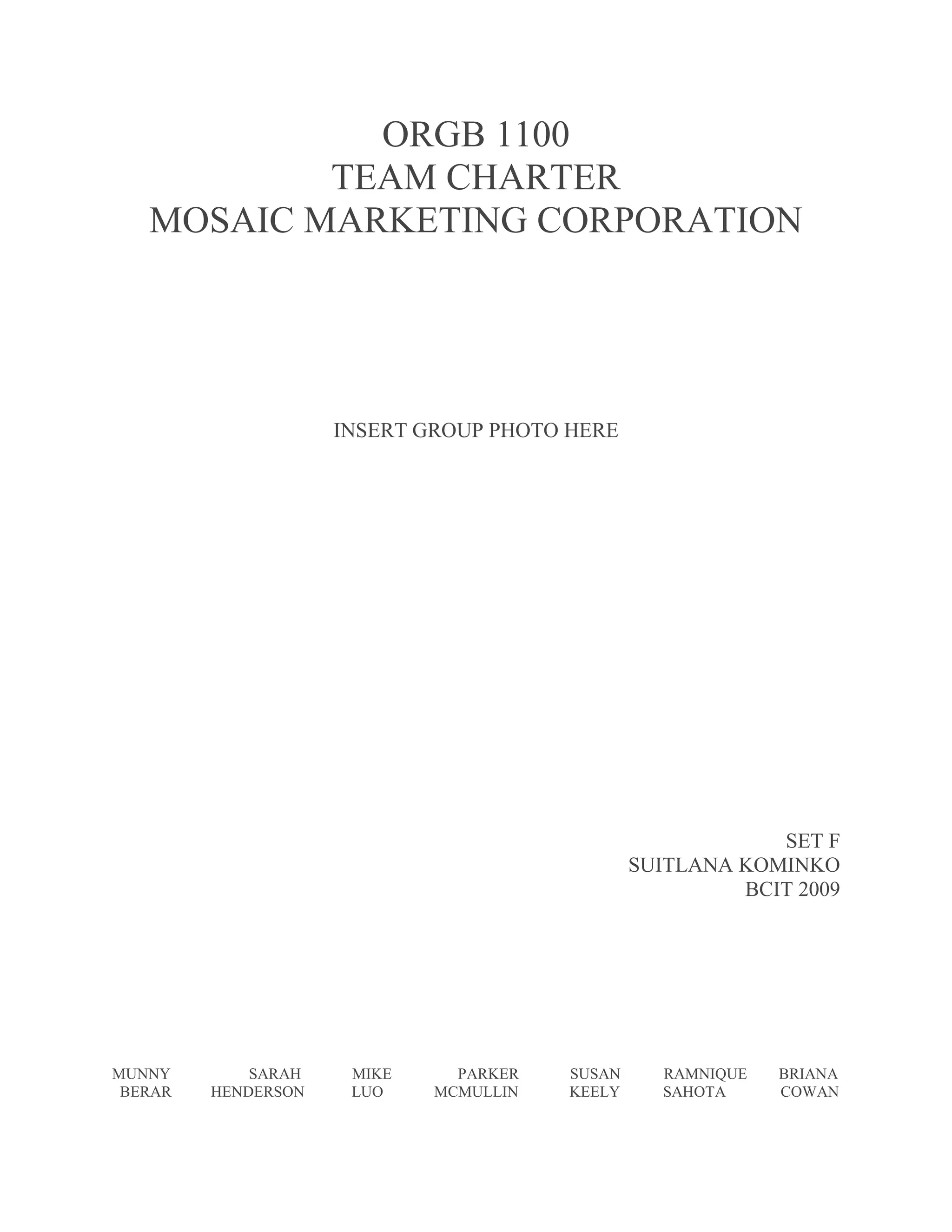 The document outlines the goals, roles, processes, and evaluation criteria for the Mosaic Marketing Corporation team. Their goals are to complete all assignments on time with 90% or higher marks while developing professional skills. Key roles were assigned based on a Belbin assessment, with challenges around balancing roles. Communication and meeting processes are established, along with progressive discipline for unexcused absences or incomplete work. Success will be celebrated when meeting grade targets, while problems will be addressed as a group.