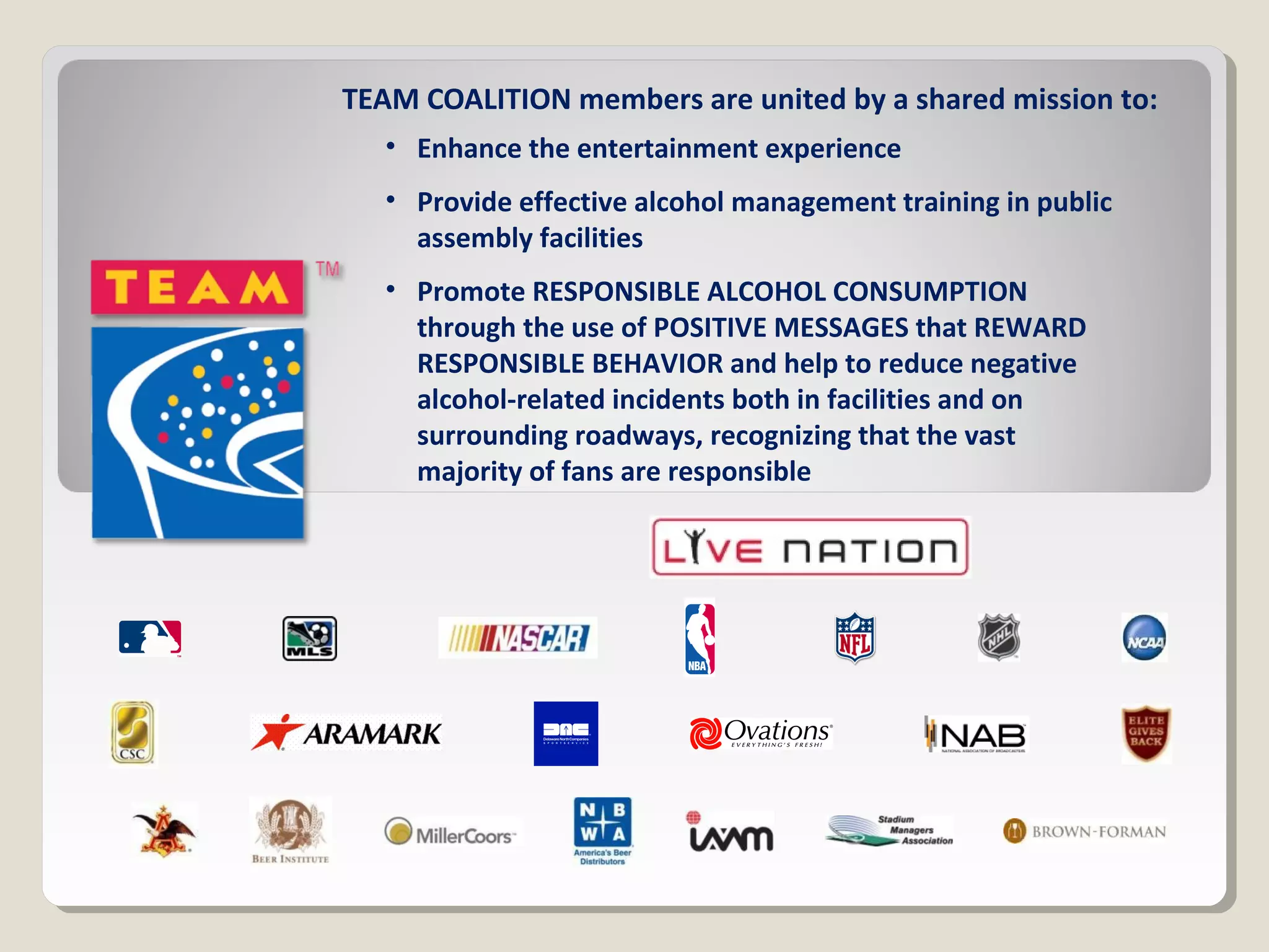 This document discusses techniques for effective alcohol management provided by the Team Coalition. It summarizes the Coalition's mission to enhance the entertainment experience through alcohol management training and promoting responsible consumption. It provides details on the Coalition's employee training programs, designated driver initiatives, and support for venues on alcohol policies.