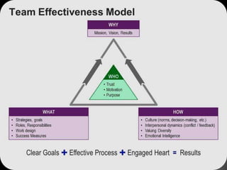 This document discusses team dynamics and what makes an effective team. It defines a team as a group of two or more people assigned connected tasks within a company. Team dynamics are the relationships between team members and how they work together, which directly impacts productivity. The document outlines different types of teams and describes how team dynamics can be improved through teamwork, understanding each other, and showing respect. It also discusses the stages of team development and elements that influence team cohesiveness and performance.