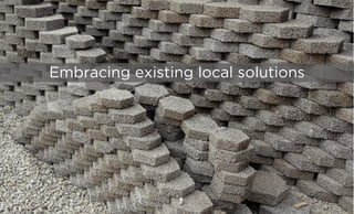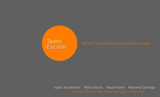 The document discusses the team Escalar's efforts in Tijuana, Mexico, focused on leveraging local solutions for social entrepreneurship through the use of permeable pavers. It highlights a community-driven model aiming to enhance disaster prevention, urban development, and public health by engaging various stakeholders. The initiative seeks to empower the local community and scale successful solutions that can be adopted globally.