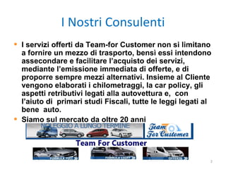 Team for Customer offre servizi di consulenza per la gestione di flotte aziendali, assistenza e formazione, con oltre 20 anni di esperienza nel settore. I consulenti lavorano a stretto contatto con i clienti per personalizzare le offerte e semplificare le procedure d'acquisto, affrontando anche aspetti fiscali e legali legati ai veicoli. Solo soluzioni su misura sono proposte, ottimizzando i processi di customer experience attraverso strumenti tecnologici avanzati.