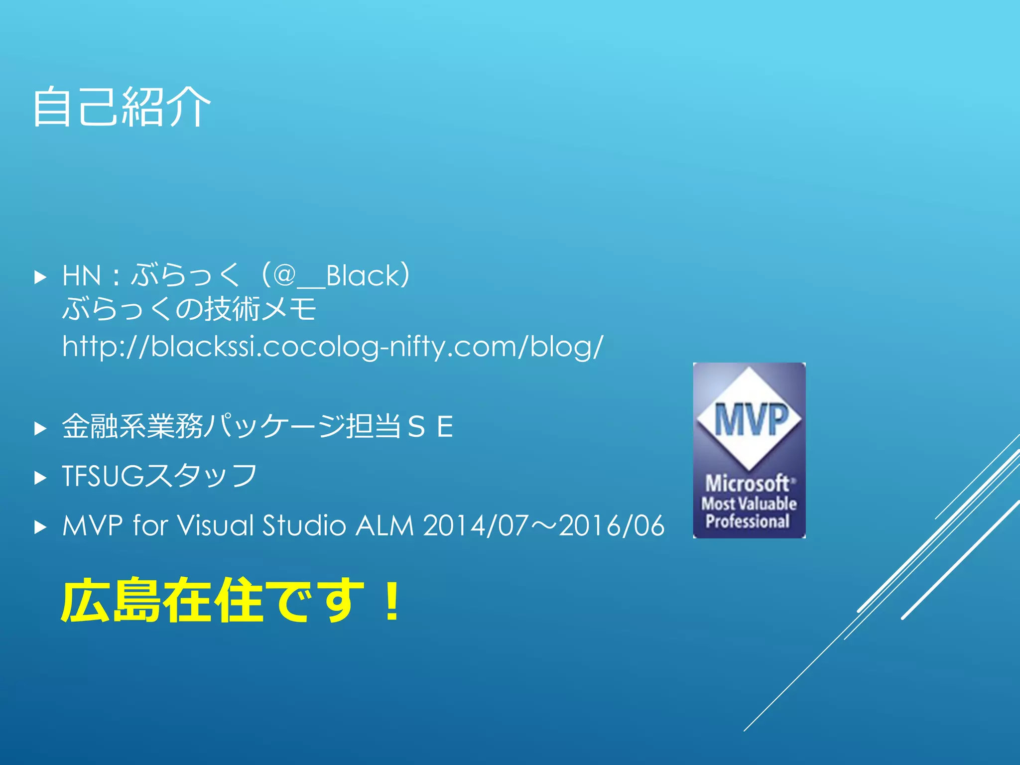 TFSUGスタッフ MVP for Visual Studio ALM 2014/07~2016/06 広島在住です!
