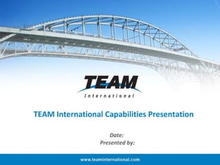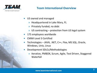 TEAM International is a US-owned IT services company headquartered in Florida with an operations center in Kharkov, Ukraine. The Kharkov center has 100 employees and was established in 2004 to provide development services with a 4 hour overlap with the US. Quality management processes are integrated throughout the lifecycle and major methodologies used include Agile, Scrum and PMBOK. Clients have provided positive testimonials about TEAM's responsiveness and ability to effectively extend development teams.
