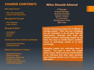 The document outlines a training program focused on team management skills specifically tailored for IT professionals, addressing challenges like conflict management and motivation within technology teams. It highlights the qualifications of trainer Mr. Asad Ur Rehman, who brings over 24 years of experience in managing IT projects and teams. The course is scheduled for March 22, 2014, in Karachi, with fees and discount options provided for early and group registrations.