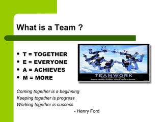 This document discusses team building skills and effective teamwork. It defines what a team is, differentiating it from a group. The key aspects of team building include forming, storming, norming, and performing as the team develops. Characteristics of effective teams include clear goals, defined roles, open communication, effective decision making, balanced participation, valuing diversity, and cooperative relationships. Methods for building an effective team outlined are good leadership, sharing goals with the team, regular team meetings, resolving conflicts, and appraising/rewarding the team. Benefits of teamwork include enhanced creativity, efficiency, performance, reduced stress, innovation, and unity.