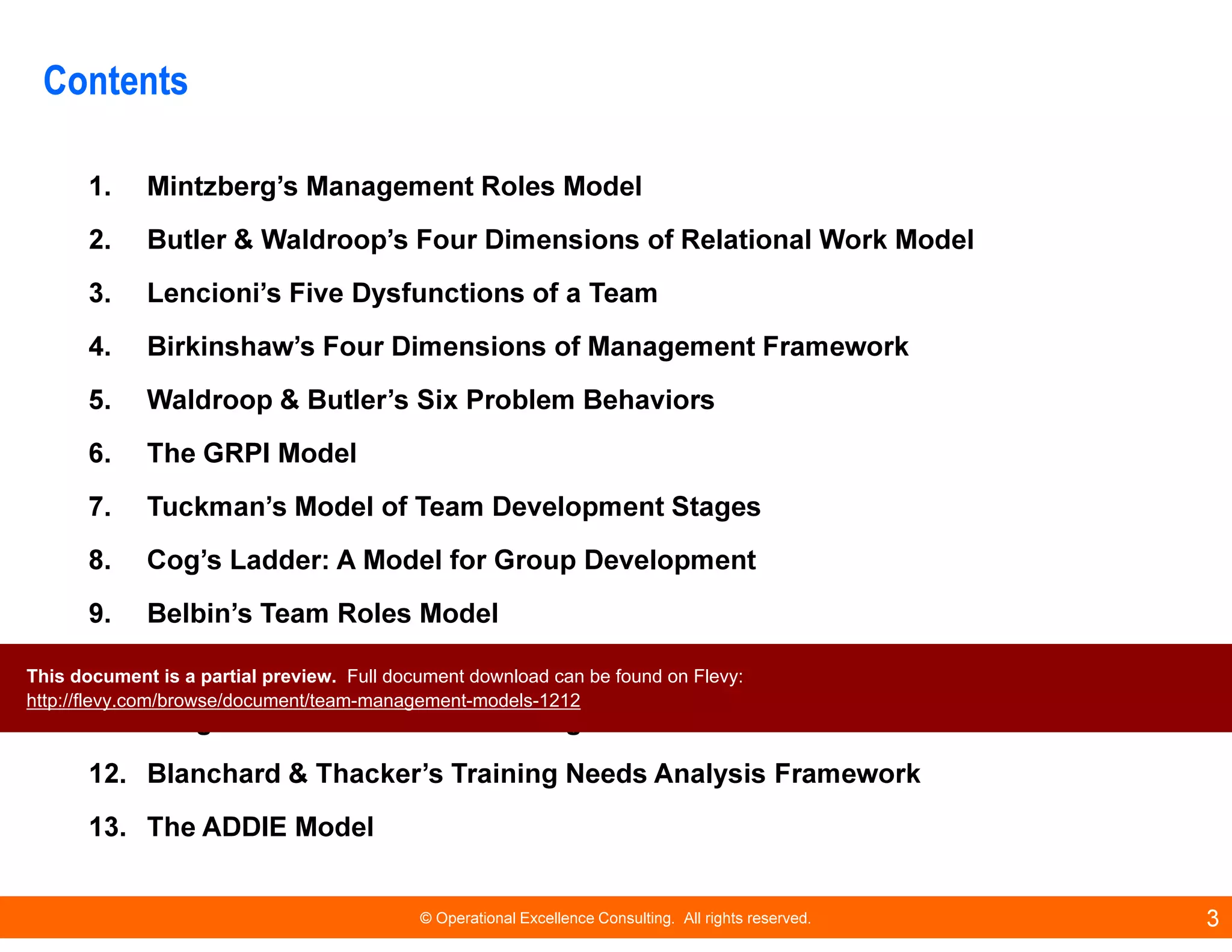 This document presents a collection of team management models and frameworks, including 26 different concepts like Mintzberg's management roles and Lencioni's five dysfunctions of a team. It provides templates and diagrams for each model, which can be used to improve team dynamics and management practices. The document serves as a partial preview, with full versions available for download on Flevy.