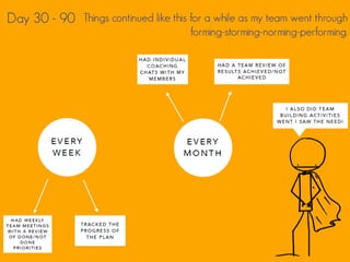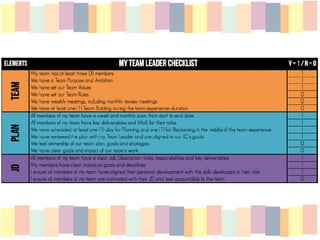 The document discusses team minimums, which are basic activities that team leaders are expected to follow to ensure high quality team experiences. It lists the elements of team minimums, which include having a team purpose, job descriptions, individual contributions, training, tools, direction, tracking, coaching, performance reviews, reflection, and evaluation. It explains that implementing these minimums can contribute to member productivity, development, and satisfaction. It then provides steps for implementing team minimums over a 90 day period, dividing it into start, middle, and end experiences and outlining the expected activities and milestones for each phase.