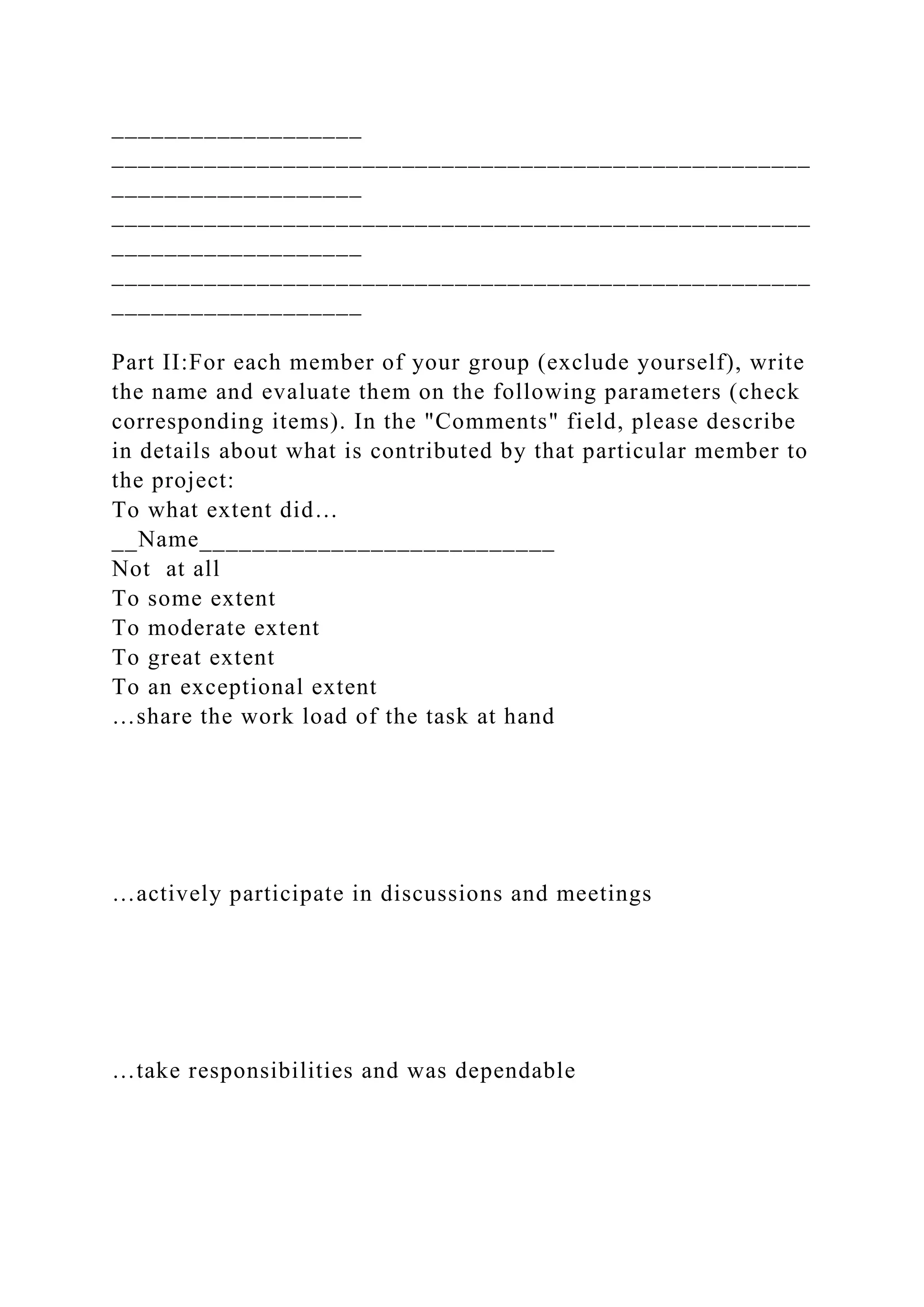 The document is a team performance evaluation form used for assessing each group member's contributions to a project in a specific course. Each student must complete it by a deadline, providing peer review scores that will impact their grades. The form includes sections for listing group members' contributions, evaluating their performance based on various metrics, and offering suggestions for improving future team performance.