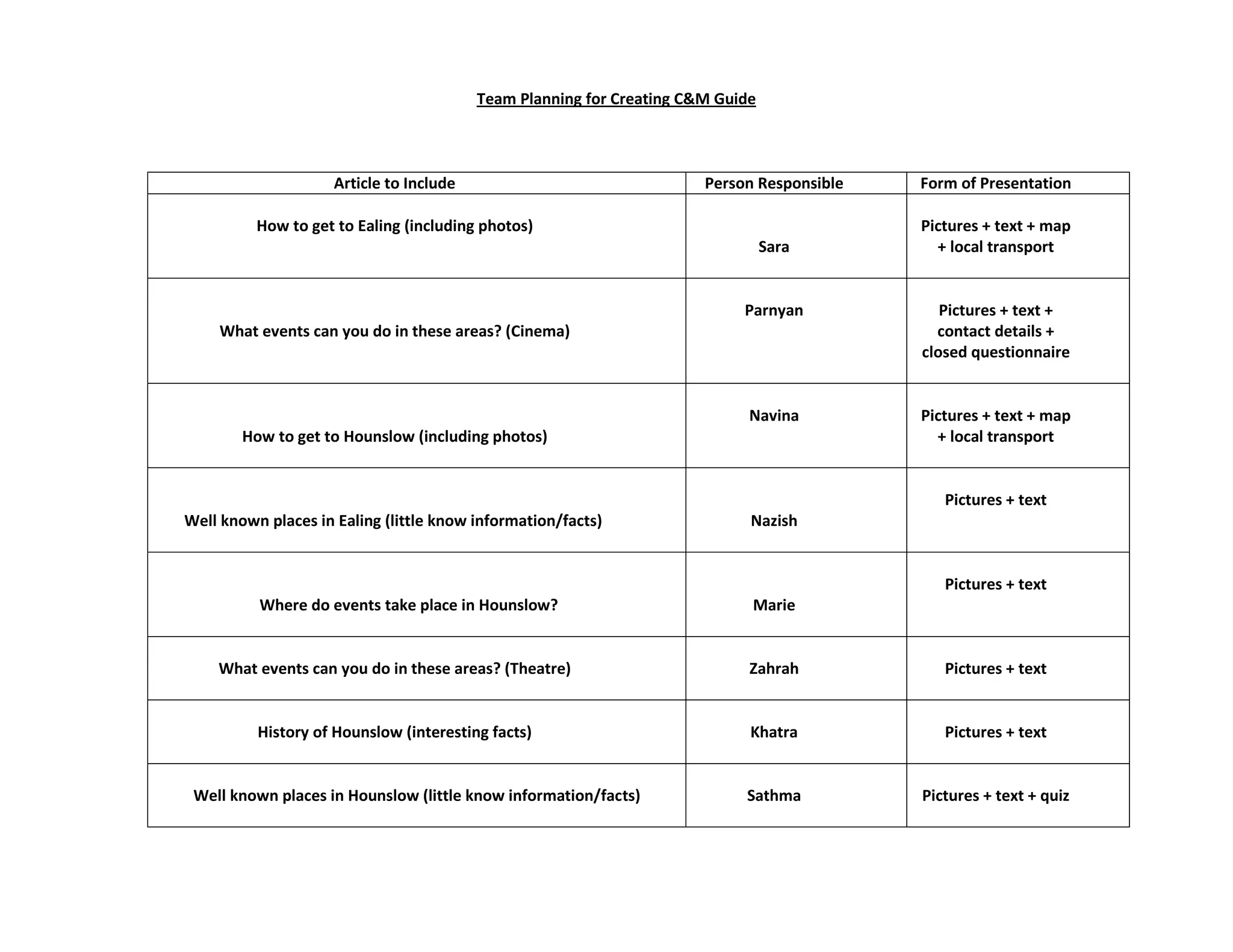 The document outlines a team project to create a guide for the areas of Ealing and Hounslow. It assigns articles on various topics related to activities and points of interest to different team members. It includes what each article will cover, who is responsible for it, and the proposed form of presentation. It also includes schedules for the whole group to organize tasks and for individuals to complete their assigned articles. The goal is for the team to work together to produce a comprehensive guide to the local communities.