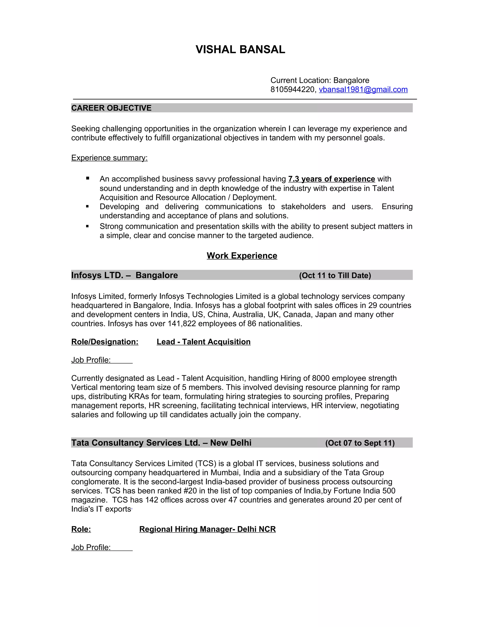 Vishal Bansal has over 7 years of experience in talent acquisition roles. He is currently the Lead - Talent Acquisition at Infosys in Bangalore, where he handles hiring of 8,000 employees. Previously, he held regional hiring manager roles at Tata Consultancy Services and HCL Technologies, where he was responsible for meeting hiring targets and leading recruitment teams. He has experience developing hiring strategies, conducting interviews, negotiating salaries, and onboarding new hires across various industries.