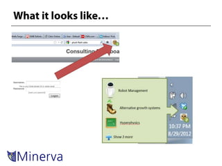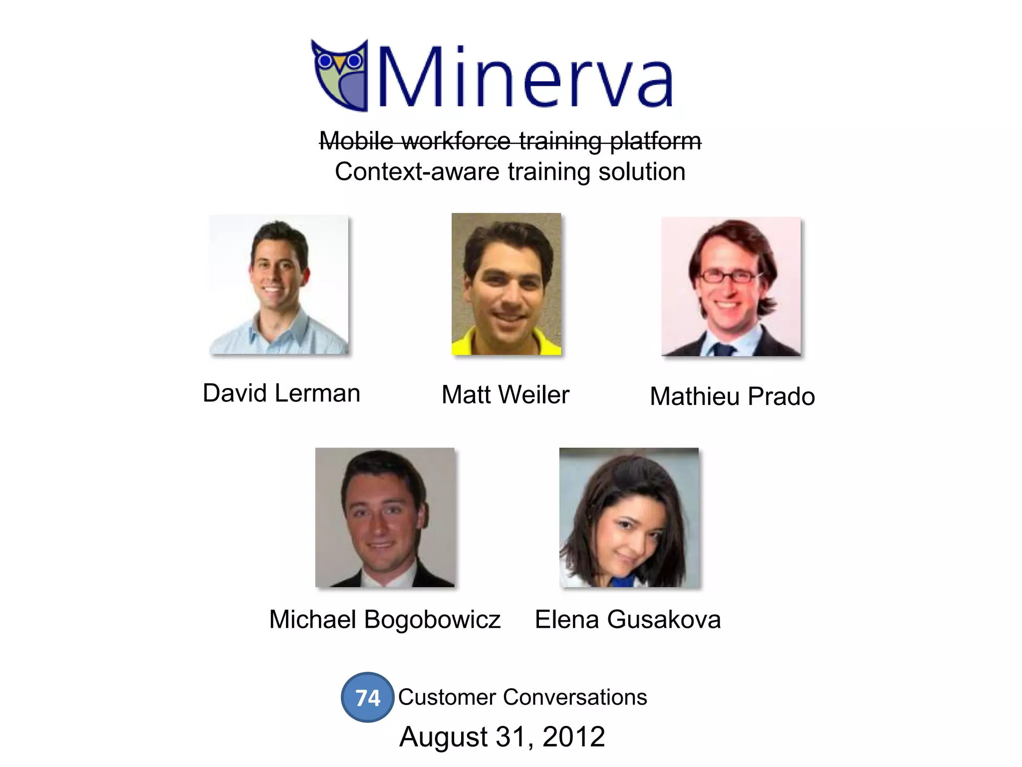 Minerva is a context-aware mobile workforce training platform that allows employers to easily develop and distribute just-in-time training content to employees on any device. The platform tracks performance to ensure content retention and offers reusable modules that decrease costs and increase ROI. As remote and contingent workforces grow significantly, Minerva provides a solution for scalable, mobile training that can be accessed anywhere, anytime.