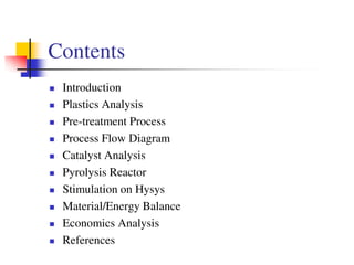 This document proposes a pilot plant design to convert waste plastic into fuel through pyrolysis. It discusses: