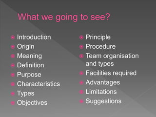 This document defines team teaching and outlines its key aspects. It discusses the origin and definitions of team teaching. Team teaching involves two or more teachers collaboratively planning, instructing, and evaluating a group of students. The goals are to make best use of teacher expertise, improve quality of teaching, and develop cooperation skills. Different types of team organizations and necessary facilities are also outlined. Advantages include utilizing teacher skills and creating variety in instruction, while limitations include difficulties obtaining teacher cooperation.