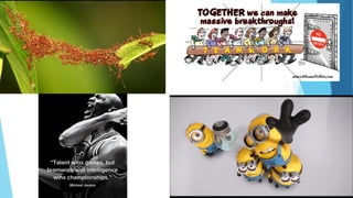 The document discusses the concept of teamwork, defining it as the ability to collaborate towards shared goals and achieve extraordinary results. Key aspects of effective teamwork include open communication, strong leadership, role clarity, and mutual trust among team members. The importance of teamwork is highlighted by its ability to enhance performance, speed of work, and provide diverse solutions to problems.