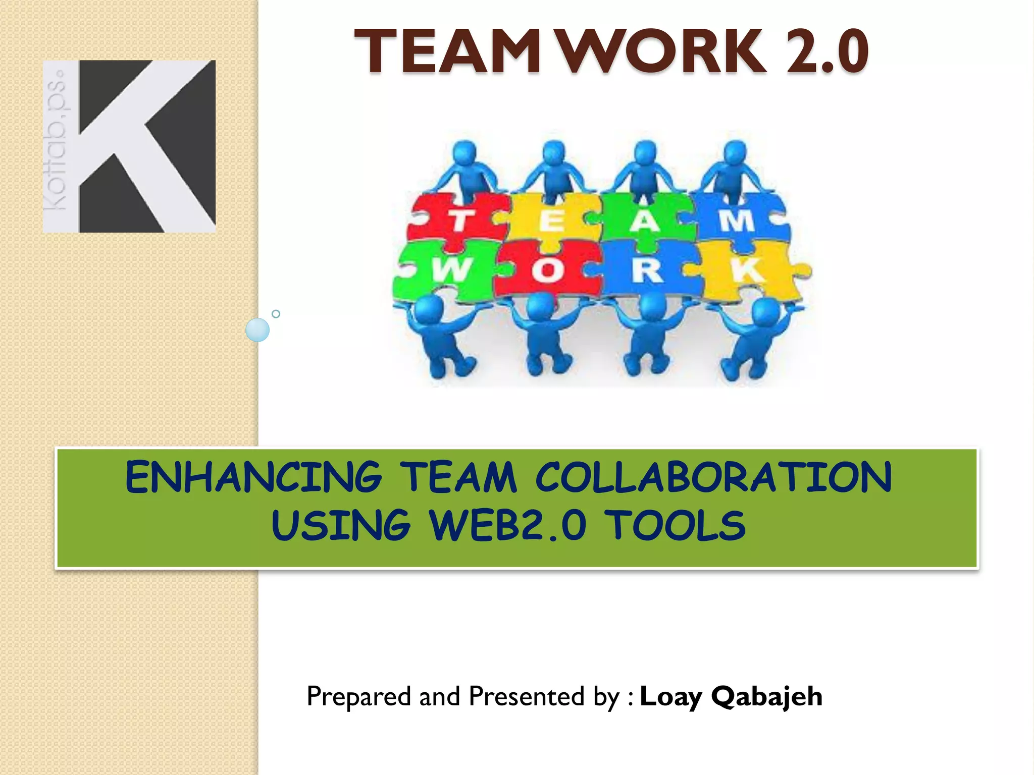This document discusses using Web 2.0 tools to enhance team collaboration. It begins by outlining the benefits of teamwork, such as accomplishing tasks faster and developing relationships. Web 2.0 tools are characterized as focusing on collaboration, being digital and mobile, free or low-cost, and allowing work from any location at any time. Examples of Web 2.0 technologies that can enable "Team Work 2.0" are discussed. These tools allow for better communication, work efficiency, and resource utilization among distributed teams. The document concludes with a case study of how one organization leveraged Web 2.0 tools for improved collaboration.