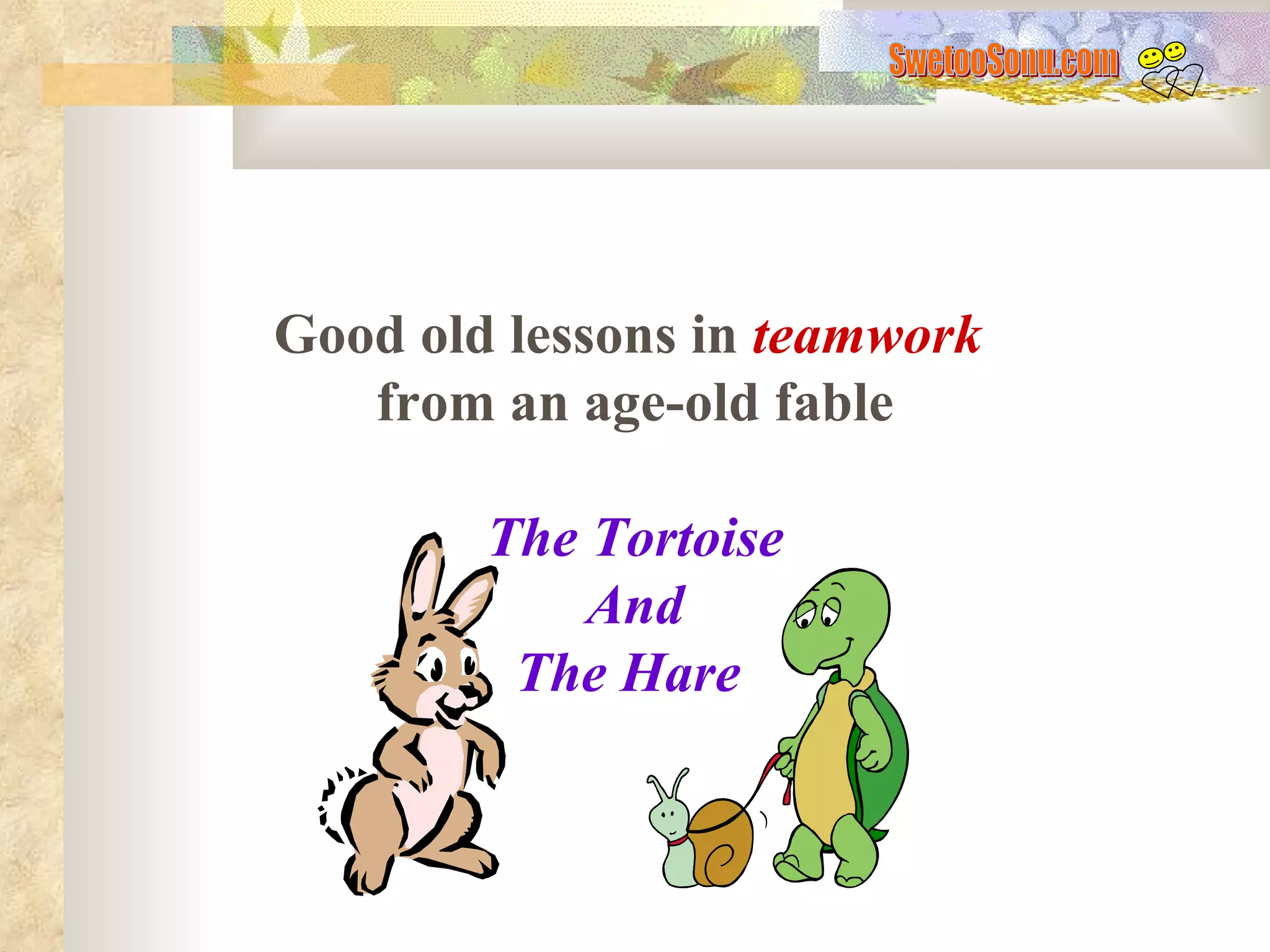 The document summarizes lessons learned from multiple versions of the fable "The Tortoise and the Hare". It discusses how the hare initially loses due to overconfidence but then wins by running consistently fast. The tortoise then wins by changing the race route to favor his strength of swimming. They realize working as a team is best by helping each other complete the race. The moral is that having strong individual skills is important but pooling talents and situational leadership within a team leads to the best performance.