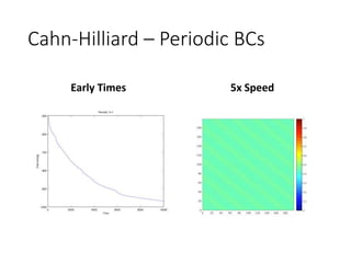 The document summarizes the results of simulations run by Team 3 from Northwestern University at the CHiMaD Hackathon on October 16, 2015. It includes simulations of the Cahn-Hilliard equation with different boundary conditions and mesh refinements, as well as Ostwald ripening simulations showing the time evolution of phase separation with periodic and zero-flux boundary conditions. Questions from attendees of the hackathon are invited at the end.