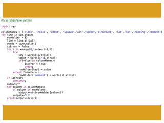 The document summarizes a Think Big Bootcamp project involving the ingestion and preliminary analysis of aircraft registry data from the FAA. It describes how the data was ingested using Python and Hadoop, then loaded into Hive tables. Initial exploration found the most frequently reported crafts and analyzed acceptance rates. Site comparison showed differences in average speed and altitude between two sites. Master data queries were created to summarize models, aircraft, and owners. Data visualizations analyzed fastest planes, speed vs altitude by make, unique flights by airline, and number of sightings by aircraft make.