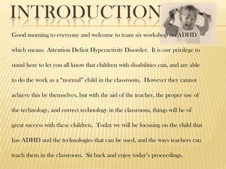 The document discusses Attention Deficit Hyperactivity Disorder (ADHD) and strategies for teachers to help students with ADHD succeed in the classroom. It defines ADHD and lists common signs and symptoms. It emphasizes the importance of identifying each student's unique needs and creating an individualized education plan. The document provides examples of classroom strategies like establishing clear rules, giving instructions in small parts, allowing movement breaks, and using technology like talking calculators to aid students with ADHD.