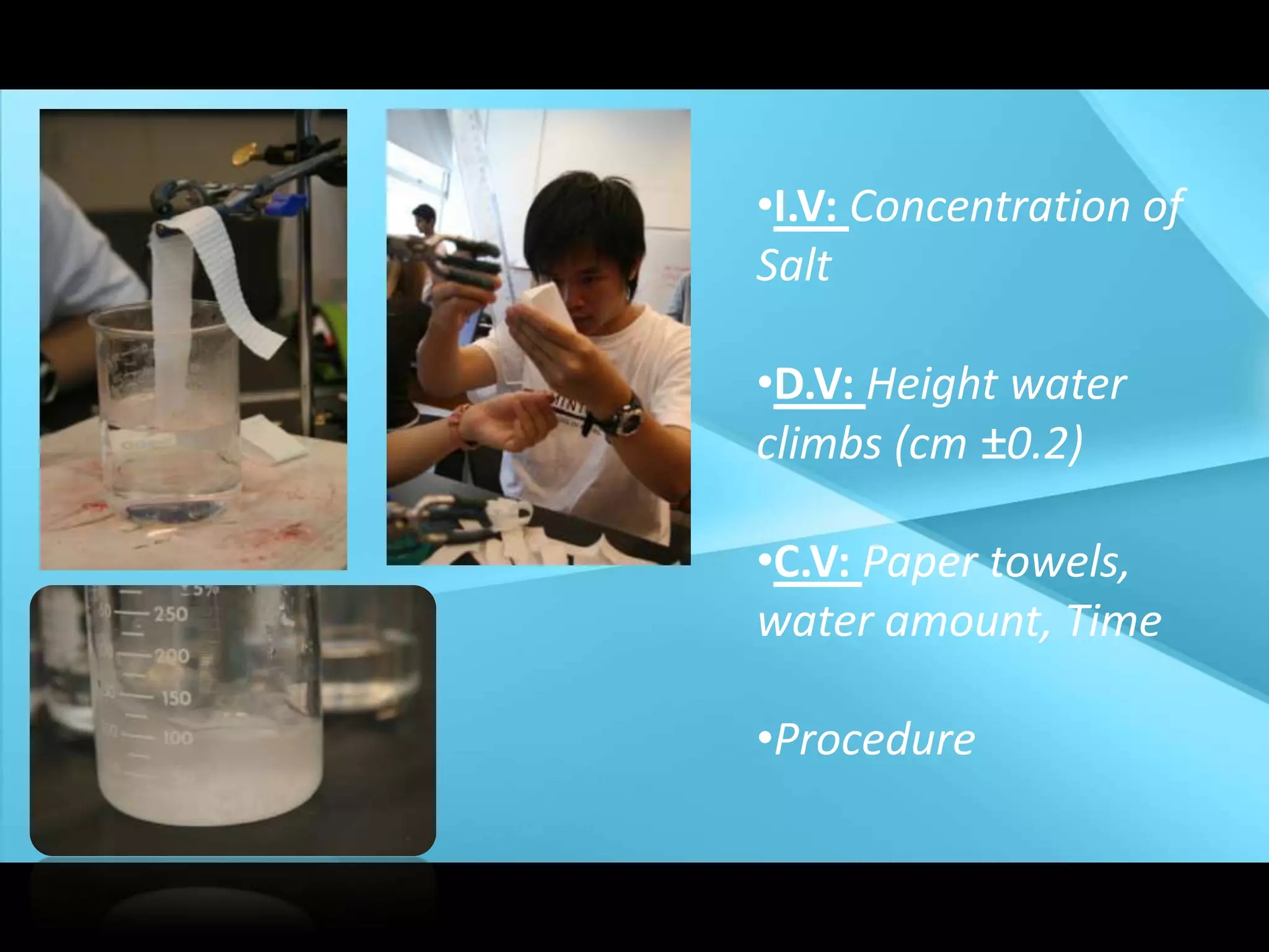This document outlines an experiment measuring the effect of salt concentration on the height water climbs in a paper towel. It lists the independent (amount of salt), dependent (height of water climb), and controlled (paper towel, water amount, time) variables. The procedure involves dissolving varying amounts of salt in a fixed volume of water and recording the height reached by the water in a paper towel over three trials.