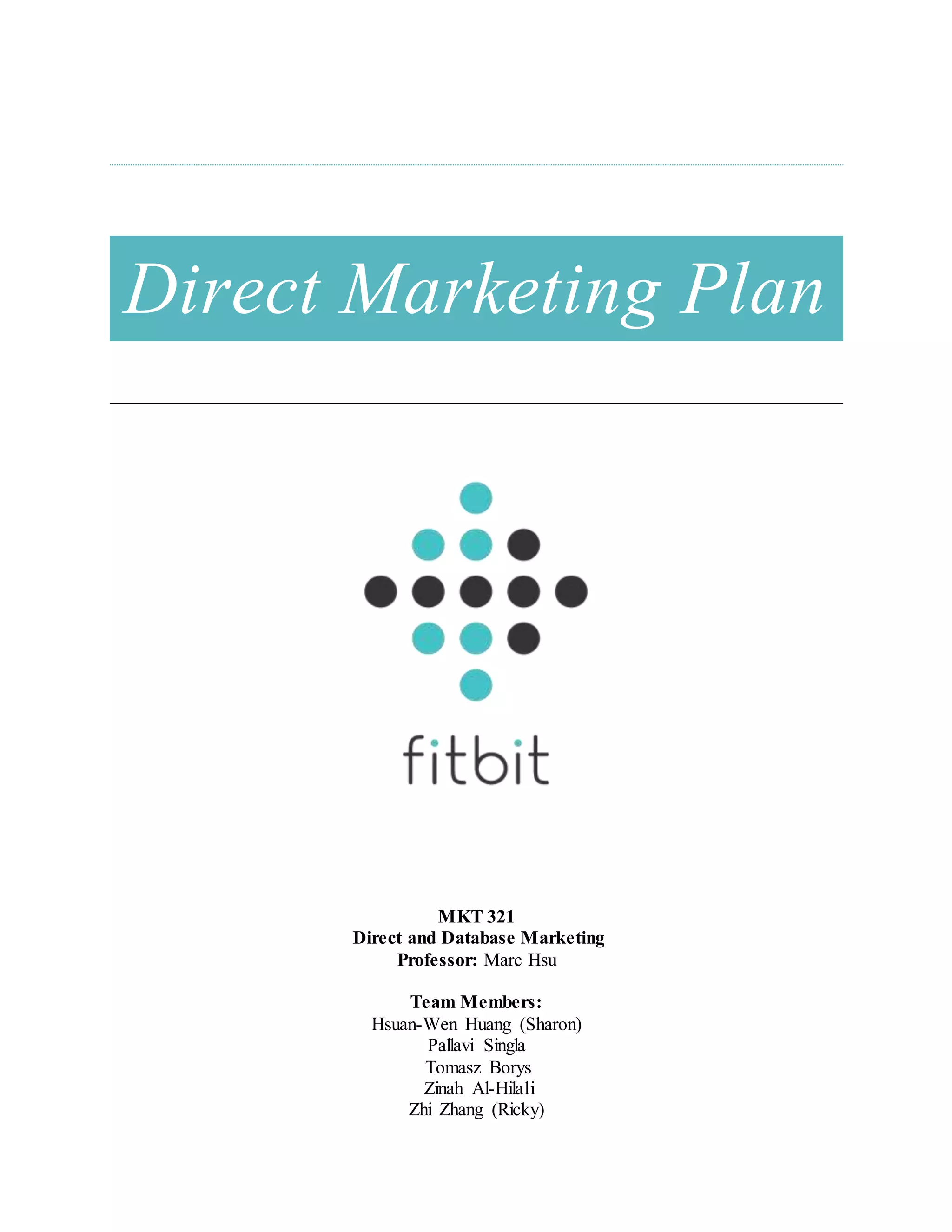 This direct marketing plan aims to increase sales of Fitbit's trackers, especially the Fitbit Charge, through a campaign targeting women ages 25-40. The campaign will use emails, direct mail, social media, and retargeting with ads offering a 5% discount. It is estimated to generate over 2000 orders over 10 months at a nominal budget. Fitbit has a leading market share in the fitness tracker industry but faces competition from Apple, Garmin, Jawbone and others. The campaign targets a health-conscious demographic based on statistics showing many women aim to lose weight and stay fit as New Year's resolutions.