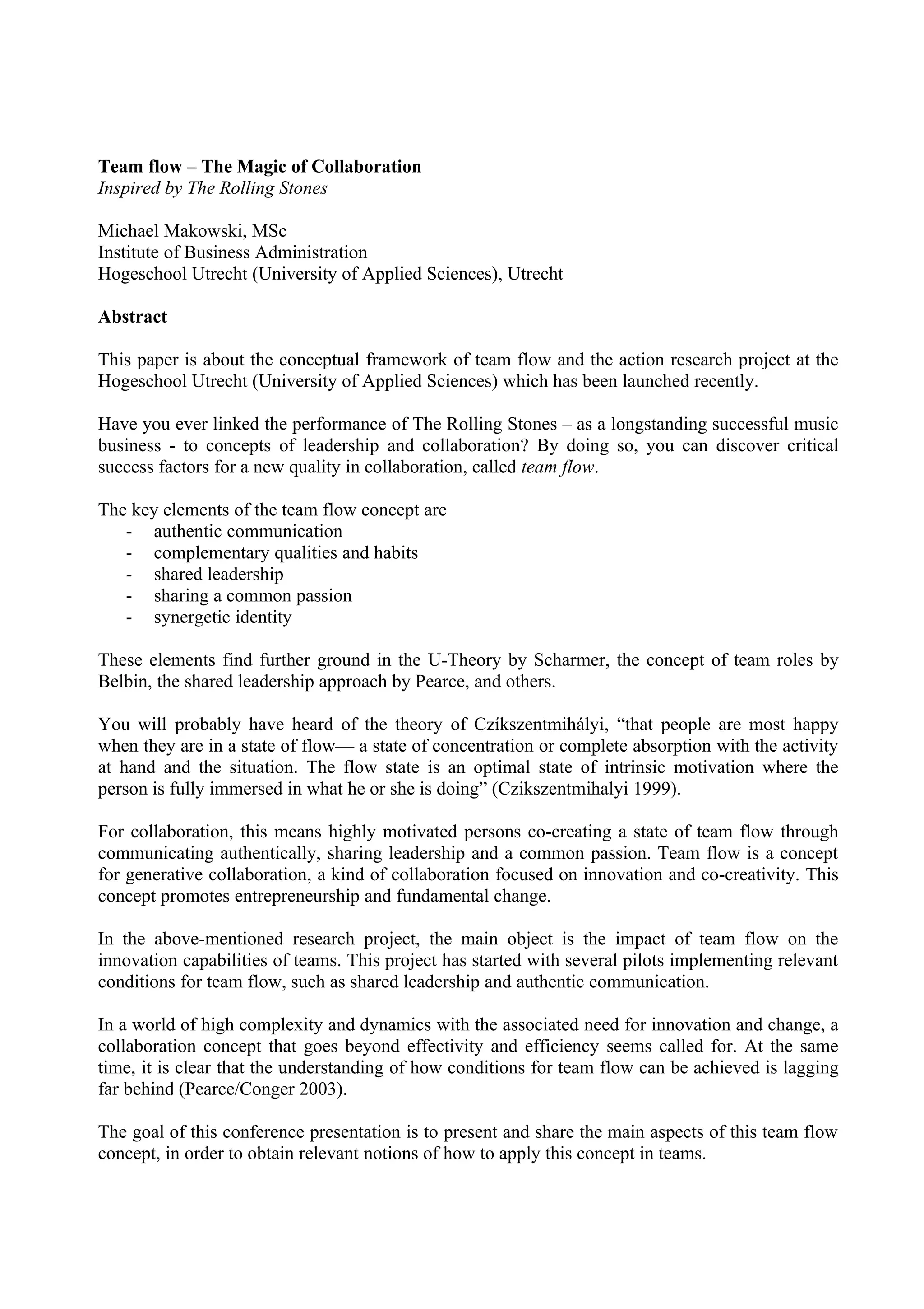 The document discusses the concept of "team flow" and how it can be seen in the long-term collaboration of the band The Rolling Stones. It identifies five key elements of team flow seen in The Rolling Stones' collaboration over 40 years: authentic communication, shared leadership, complementary qualities among band members, a shared passion for their music, and the development of a synergetic identity as a band. An action research project at a university is exploring how cultivating these elements can impact team innovation capabilities.