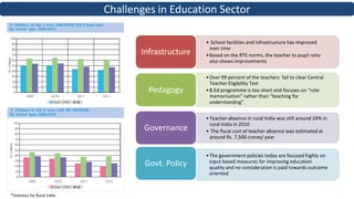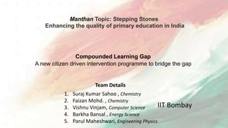 The document proposes a citizen-driven intervention program called "Stepping Stones" to bridge the learning gap among students in primary education in India by establishing a local network of citizen tutors who would provide supplemental remedial instruction to students during summer vacations using underutilized school infrastructure, with a focus on improving foundational skills in math, English, and other subjects through differential grading and targeted learning exercises. The program aims to be scalable, outcome-driven, and cost-effective by leveraging community participation and existing resources.