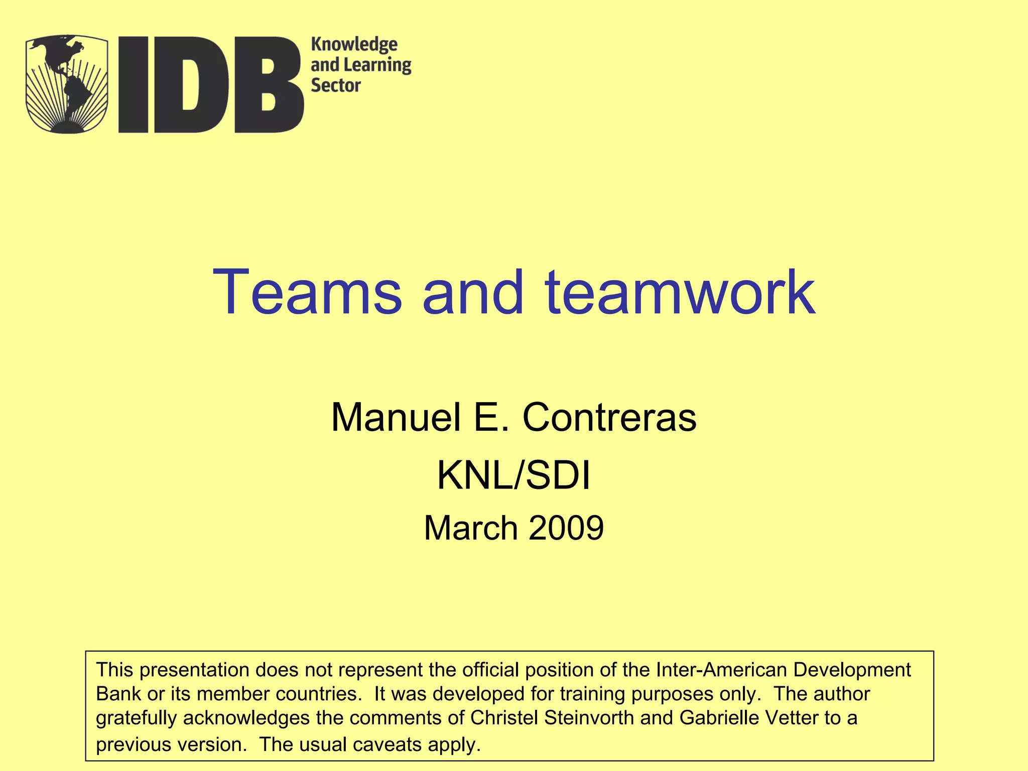 1. The document discusses teams and teamwork, defining a team as a small group of people with complementary skills who share common goals and a commitment to a shared vision.